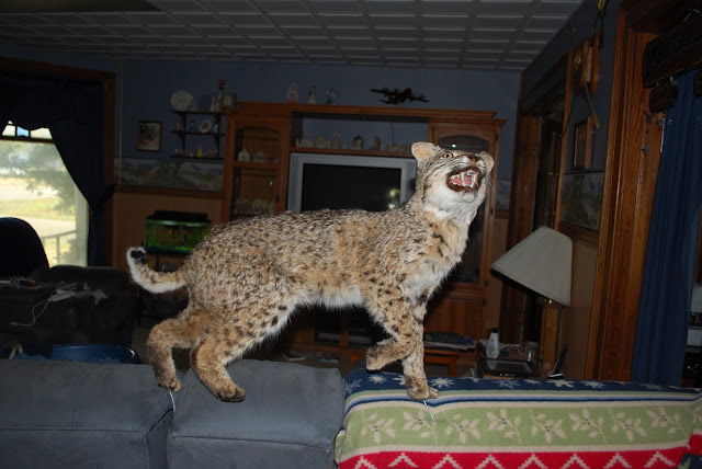 My husband brought home the bobcat my son Josh shot back in January, all stuffed & mounted. The girls didn't really care about it, sniffed it & went on with life but our male cat sniffed it & got freaked out. He spent the rest of the night, cowering through the house looking for that bobcat that he knew was going to eat him. Even when we hid it in our closet, he was still scared up to the next morning.